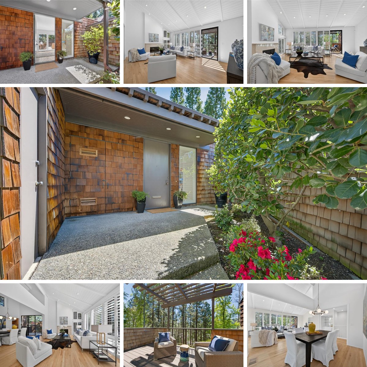 Foyer features an oversized front door with large glass sidelight, ample storage and walls of glass bringing the outdoors in.